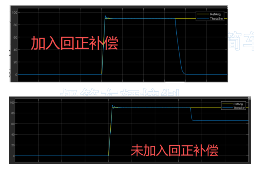 如图所示,未加入回正补偿时,方向盘角度离中位0角度还有很大距离,加入回正补偿后,角度丝滑回到中位。