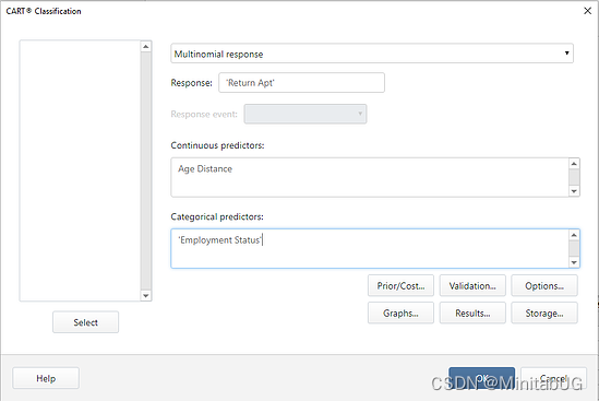 由于存在至少三组,因此她先选择多项式响应,然后在响应中选择“再次光顾的意向”,这也是她想预测的目标。接着,依次快速输入连续预测变量和分类预测变量或者要用来进行预测的其他输入,填写好对话框。