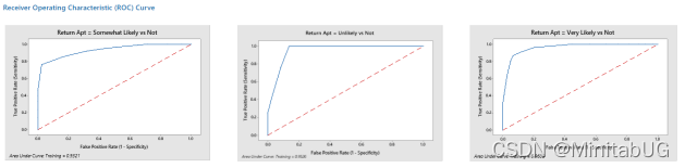 针对每一个目标变量对,CART 分析的输出会显示大于或等于 0.93 的 (ROC) 曲线下的面积值。ROC 可以帮助经理将模型预测患者再次光顾诊所的意愿的准确性进行可视化。该图显示了敏感性(正确预测为正类的正类)与特异性(正确预测为负类的负类)之间的关系。