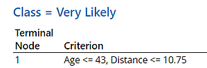 通过深入了解患者行为,将有助于地区经理创建再次光顾诊所可能性高的客户的个人资料,这样诊所中心也就能有针对性地发送额外宣传单和推出激励措施,从而确保这些客户再次光顾。例如,不满 43 岁而且与诊所距离不到 11 英里的患者,无论就业状态如何,都极有可能再次光顾。年龄介于 71 到 82 岁之间的患者,无论距离或就业状态如何,都有可能再次光顾。相比之下,年龄介于 67 到 71 岁之间的那些患者,若与诊所的距离超过 11 英里,无论其他因素如何,他们都不大可能再次光顾。
