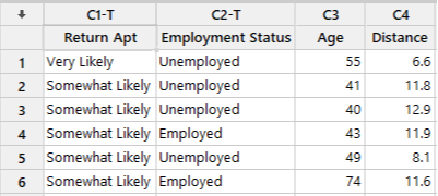 连锁免预约诊所收集患者的调查数据,询问了他们未来有多大可能性会再次光顾诊所:极有可能、有可能或不可能。诊所员工还会记录患者的年龄、从家里到诊所的距离(以英里为单位)以及就业状态。诊所的地区经理尤其关注到底是什么因素在影响无预约患者再次来诊所接受服务的意愿。