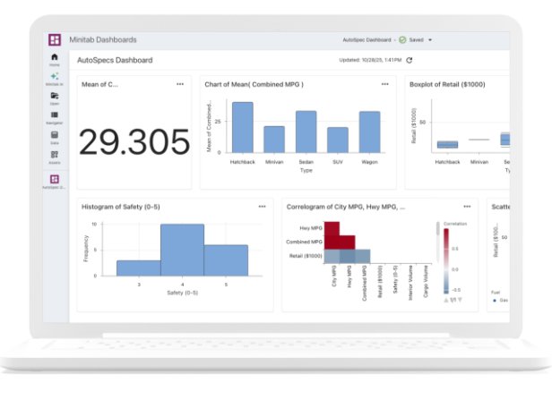 用 Minitab Dashboards(仪表盘)快速生成交互式 AI 可视化报表,报表可根据数据自动适配调整。你可以将模拟输出数据与真实业务指标并列对比,从而确定最优的优化路径。