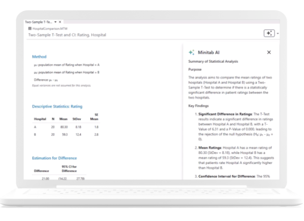 最后,让 Minitab AI 把复杂的数据转化为通俗易懂的洞察结论与行动建议。你可以用这些结论验证优化效果,挖掘下一轮改进机会,并将成果反哺到Workspace或 Simul8 中,驱动流程持续优化。