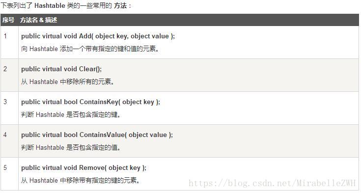 Hashtable 类代表了一系列基于键的哈希代码组织起来的键/值对。它使用键来访问集合中的元素。