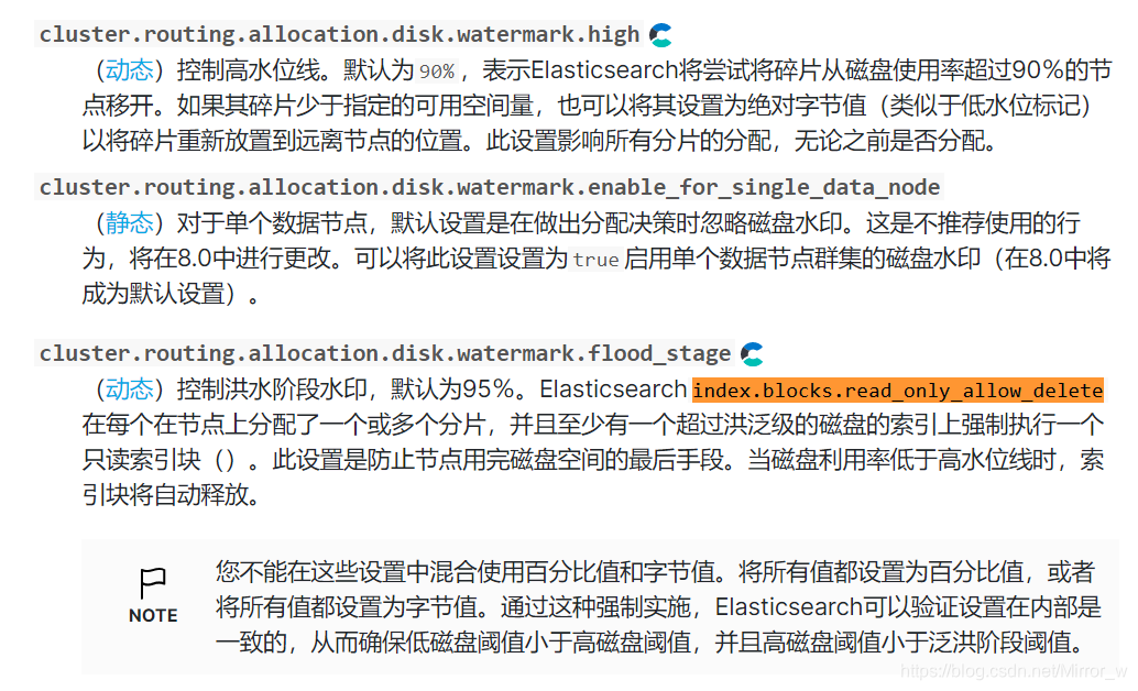 这时就是因为你的磁盘空间不足导致的,当磁盘的使用率超过95%时,Elasticsearch为了防止节点耗尽磁盘空间,自动将索引设置为只读模式。