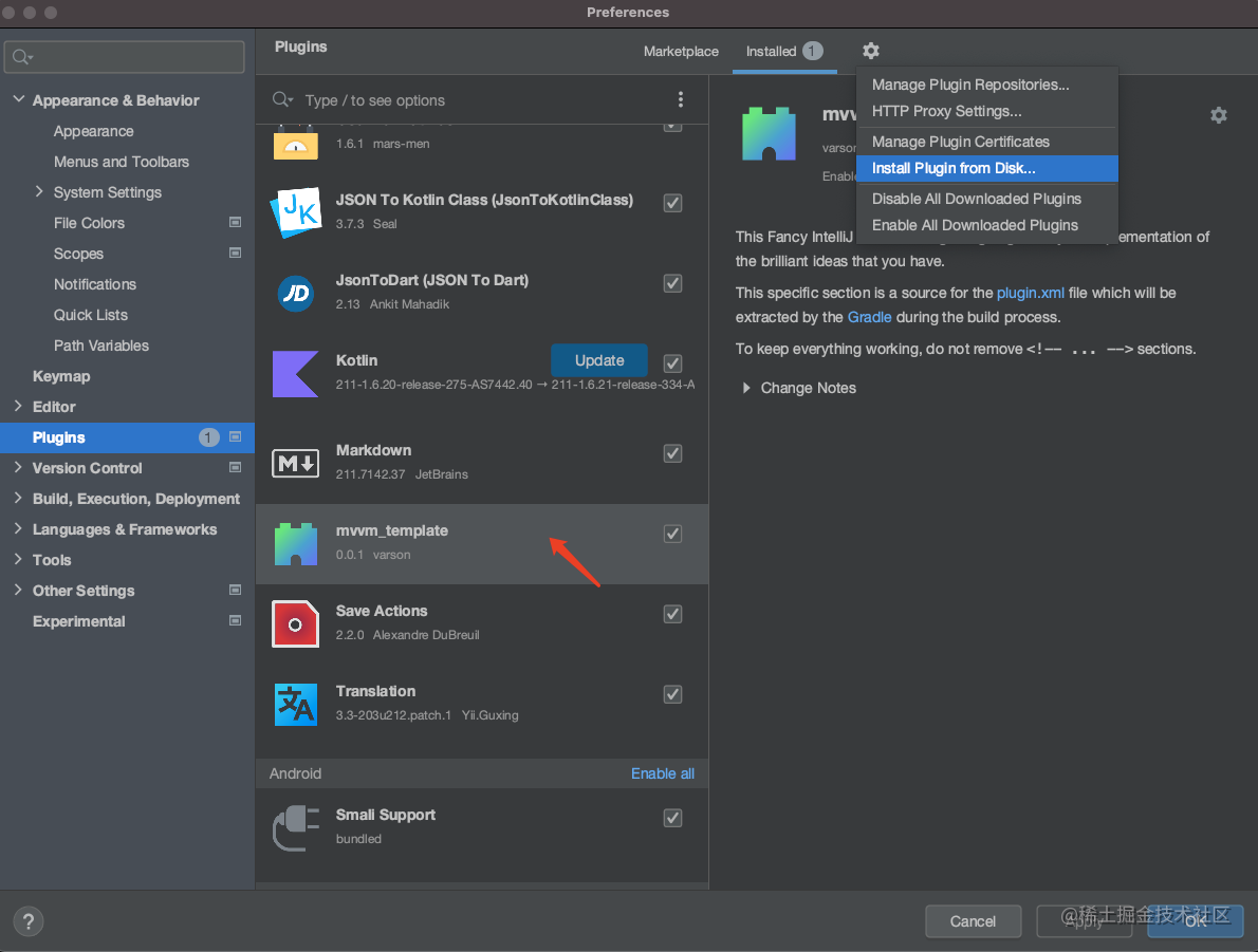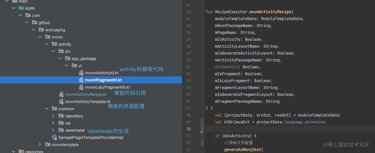 在项目中,我们总会有一些框架内的模版代码需要反复创建,耗时且低效,怎么忍受的了,这些反复搬来搬去的东西所费的时间用来摸摸鱼,不香?Android Studio 4.1及以后的各动物版本,对模版代码的支持是以插件的形式来处理 通过对插件的基础配置以及项目模版代码的配置,最终以jar的形式安装到Android Studio的本地插件中,以此来创建模版代码(案例:mvvm_template)