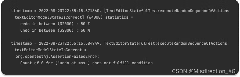 这就是为什么收缩在有状态测试中如此有用的特性:收缩样本是导致测试失败的最简单的样本,原因相同。在这种情况下,它是序列TextChangeAction、UndoAction和TextChangeAction。