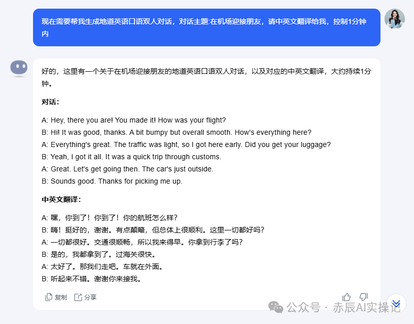 这一步我主要演示如何用AI生成英语情景对话文案。