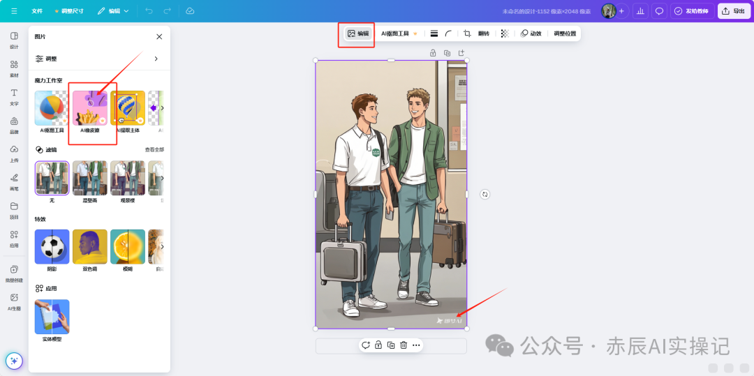 导入即梦生成的图片,接着点击编辑-AI橡皮擦,在画面中带水印的地方进行涂抹,这样就可以做到一键去除水印效果。