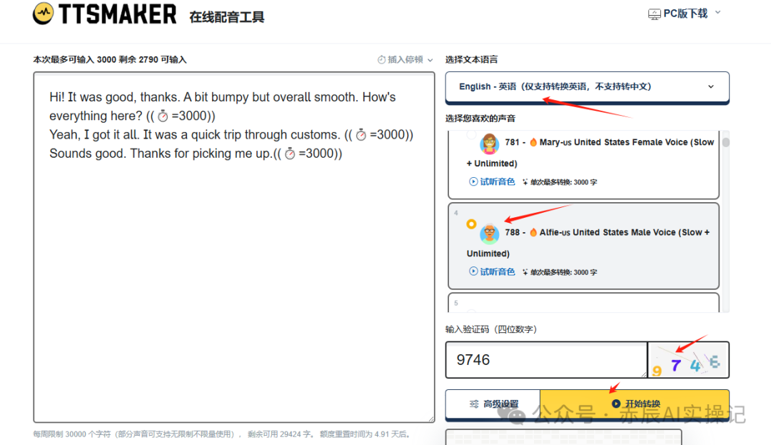 将文案内容复制到输入框中,设置停顿时长,然后选择文本语音,找到满意的音色,点击高级设置进行参考调整,最后输入验证码,点击开始转换即可。