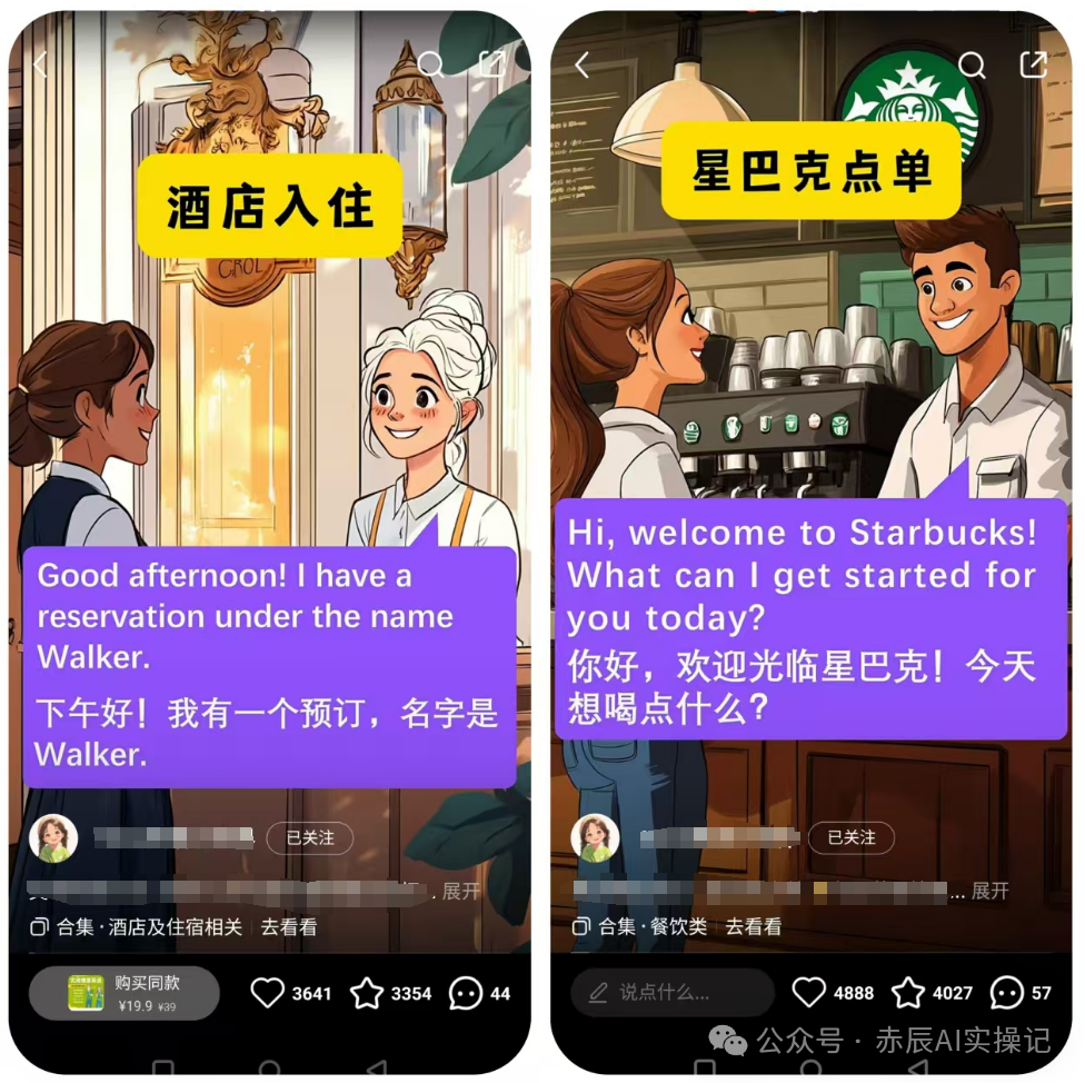 加上AI生成的画面美感度高,场景式的英语口语对话类内容能够为用户提供实际的语言学习帮助,满足用户提升英语水平的需求,所以这类视频可以短时间快速圈粉。