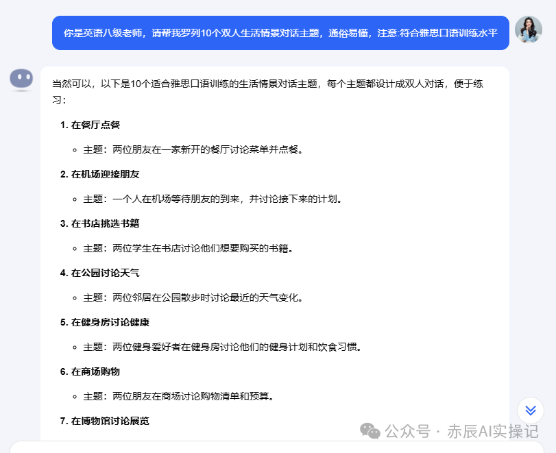 咱直接打开KIMI,发送指令,让AI帮我生成10个双人生活情景对话主题。