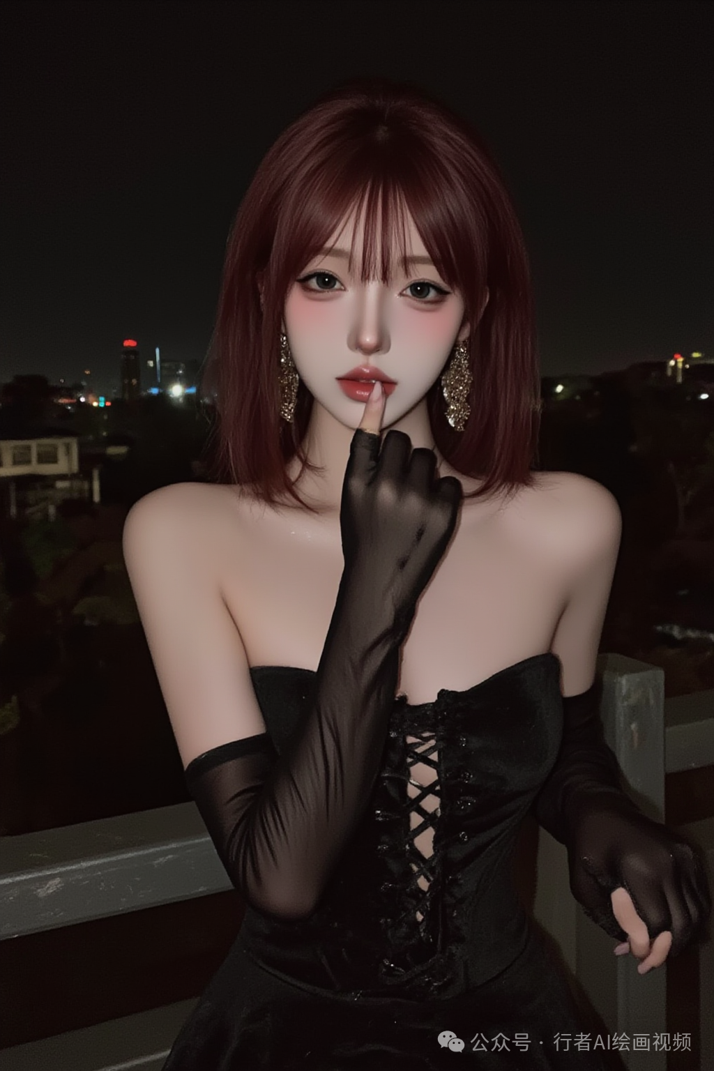提示词:This is a high-resolution photograph of a young woman with a fair skin tone and a slender physique. She has shoulder-length,straight,dark red hair that is slightly tousled,and her eyes are partially covered by her hair. Her facial expression is contemplative,with her lips slightly parted and her right index finger resting on her lower lip. She is wearing a strapless,black velvet dress with a lace-up front,accentuating her small breasts. The dress has a fitted bodice and a flared skirt. Her left arm is adorned with a long,sheer black glove that extends to her elbow,adding a dramatic and gothic element to her outfit. She also wears large,ornate gold earrings with dangling elements. The background is dark,suggesting an evening setting,with a hint of city lights visible in the distance,indicating an urban environment. The woman stands against a railing or balcony,which is barely visible due to the low lighting. The overall mood of the image is moody and introspective,with a focus on the subject’s striking appearance and the contrast between her dark attire and the subdued background,