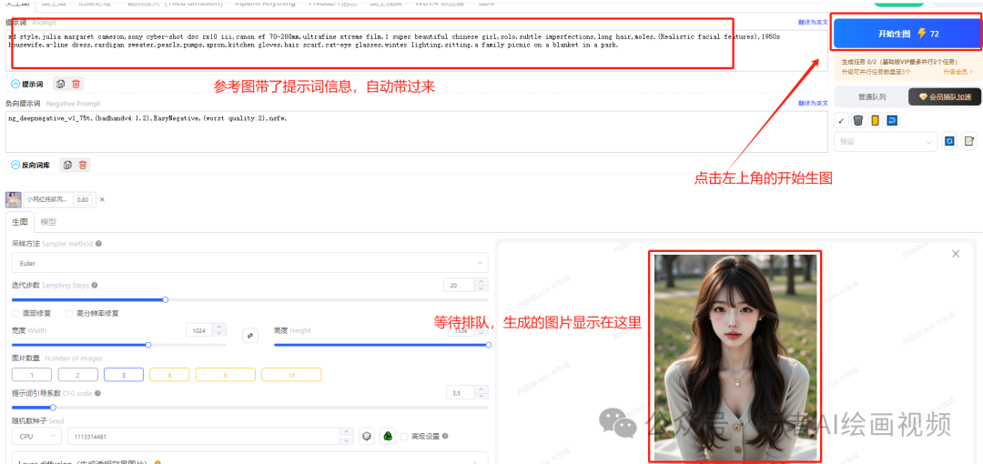 在lora 的返图区,直接点击一键生图,在线生成
