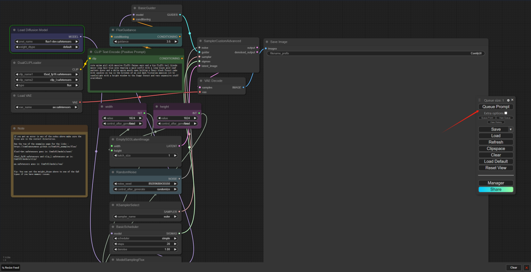 都配置完成后,点击 Queue Prompt 运行工作流。