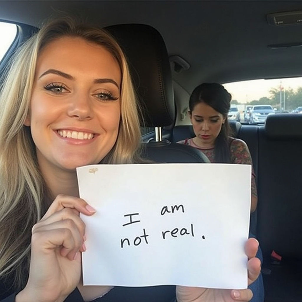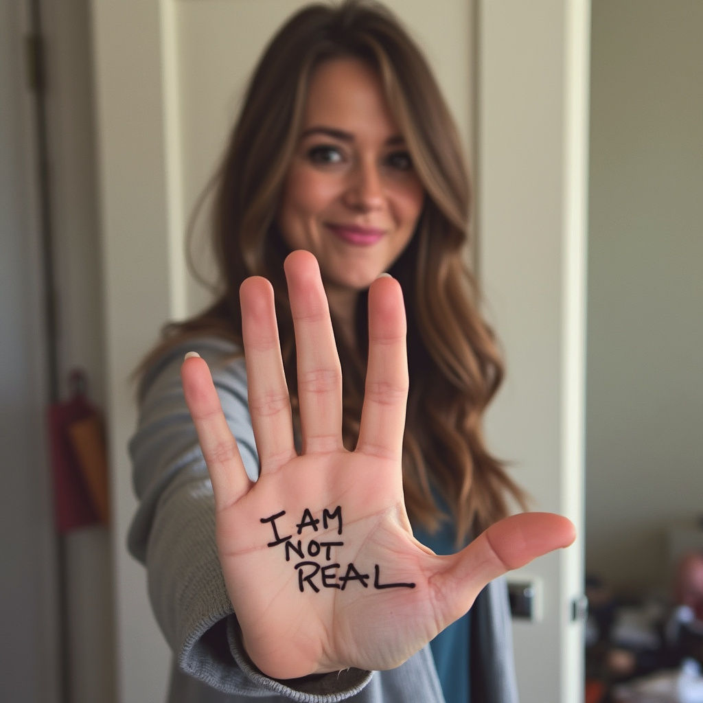 甚至还能精准控制生成的文字,比如在手上和纸上写:I am not real.