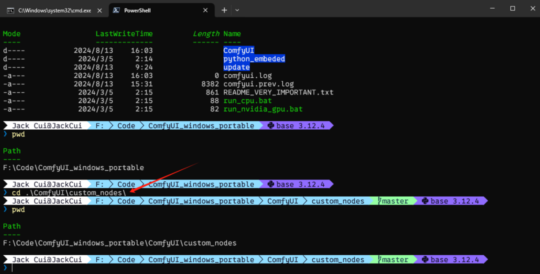 可以看到我的 ComfyUI 存放到了F:\Code\ComfyUI_windows_portable目录下,接着我们进入到 custom_nodes 目录下,使用指令: