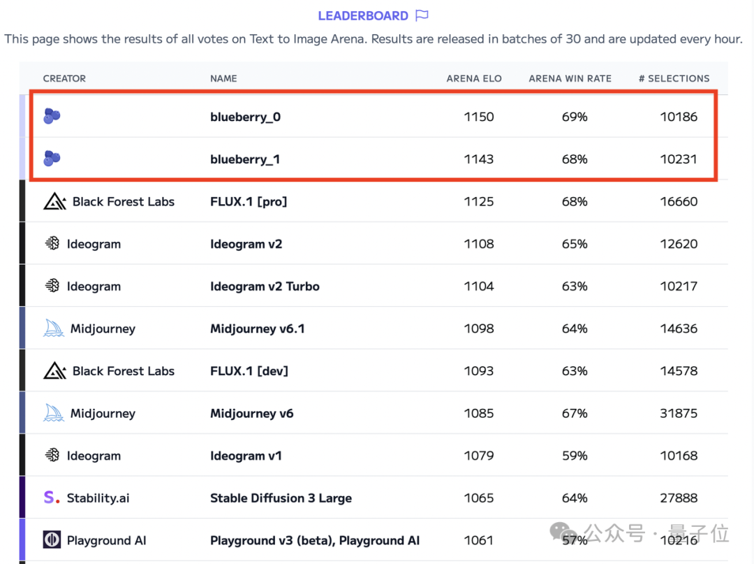 官方不藏了,直接放出数据,在Artificial Analysis image arena上,**FLUX1.1 [pro]**以“blueberry”为代号,超越所有其它模型,获得最高的整体Elo评分。