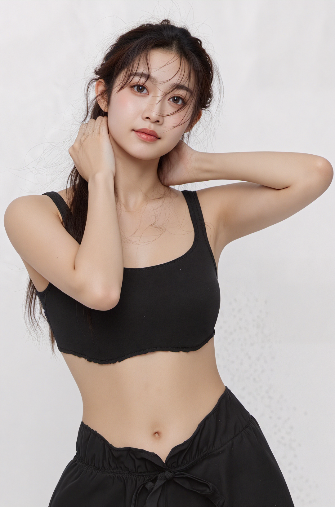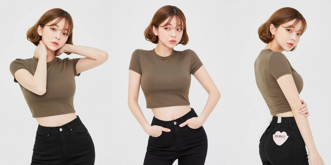 Photos in raw format, HD, 8K, highres, detailed A real model outfitting photo, capturing the character in three views, namely the left side, the front side, and the right side. The characters are the same person to maintain consistency, featuring consistent clothing, consistent hairstyle, and maintaining an overall display for a comprehensive view of the attire. On a white background with professional studio lighting. This diagram consists of the following parts: [Left view] : The young woman stands with her hands behind her neck, showcasing her confident posture. Her hair is slight disheveled, adding an element of casualness to her style. Her calm and neutral expression complements the sexy black bar top and ultra-short skirt perfectly. Her tan skin, with subtle details like dimples and minimal freckles, creates a natural contrast with the outfit. (Clothes and accessories should be fully described without any missing items); [Middle view] : A full body front photo of the young woman standing with her hands in her pockets, exuding a relaxed and composed aura. The front perspective emphasizes her slender figure and the sexy appeal of her black bar top paired with the ultra-short skirt. Her facial features are portrayed with emphasis on skin texture, eyes details, and her calm neutrality. The outfit, perfectly framing her youthful vibrance, is depicted with high detail to capture all accessories and to hold none of the style back. (Clothes and accessories must be fully described without any missing items); [Right view] : The right-side image captures her standing with her hands lightly touching her side, giving a playful yet calm demeanor. The intricate details of her pose in contrast with the fabric of her clothing bring out the quality of materials used in her seductive attire. Her skin details are softly illuminated, highlighting the beauty marks subtly like light freckles. The black bar top and ultra-short skirt remain consistent, displaying a coherence in her fashion choices and personal style. (Clothes and accessories must be fully described, no missing items);