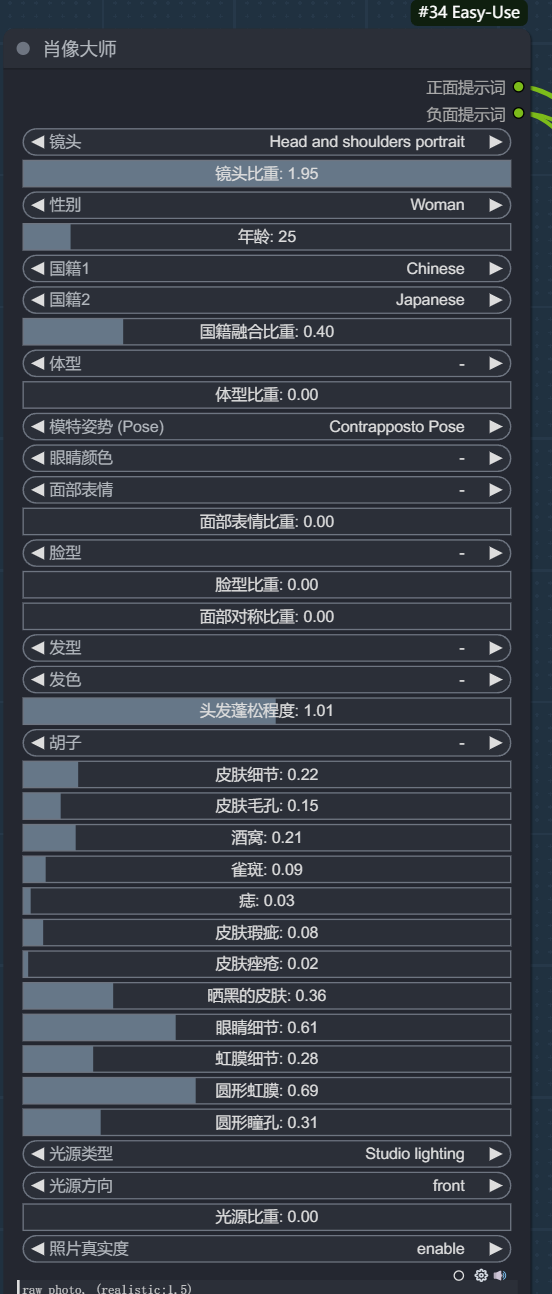首先,设置设计好模特的特征。使用肖像大师这个节点,定义。