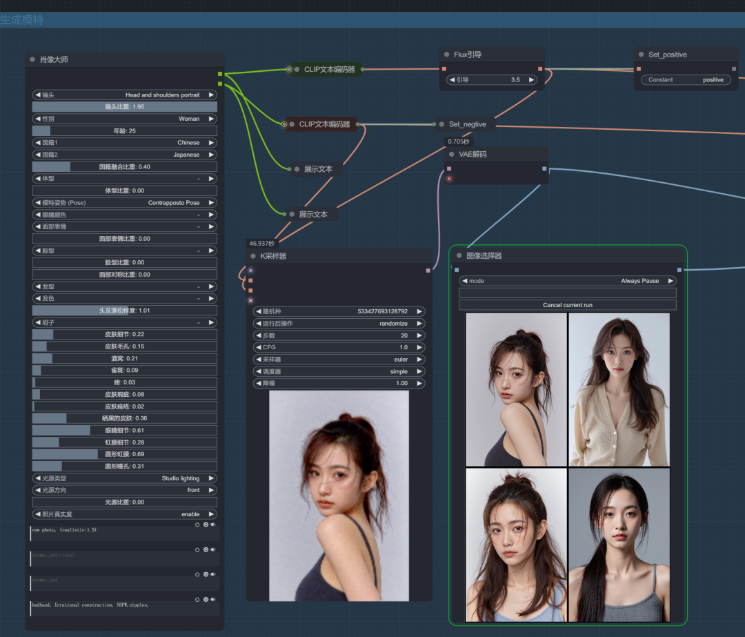 这个环节很有意思,有种皇上选妃的感觉😂。原理是通过肖像大师节点,为我们生成一个顺眼的模特的脸。