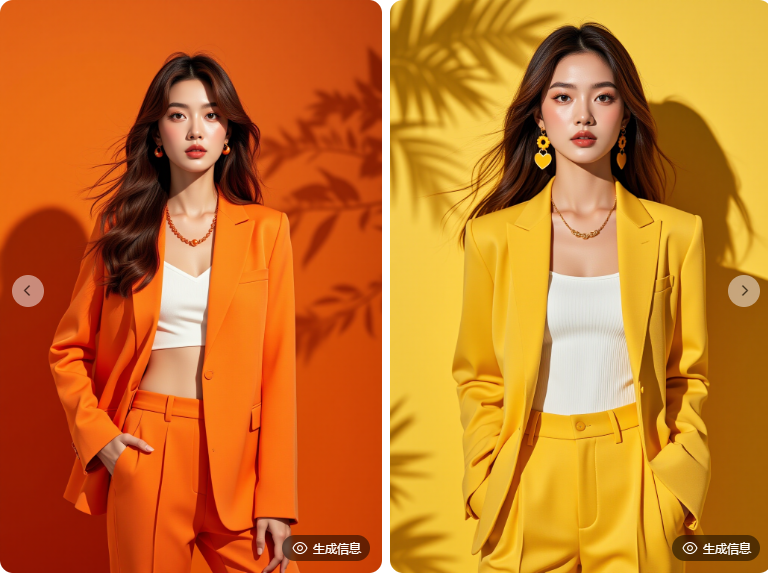 关键词:年轻女子,橙色外套,橙色裤子,珍珠白上衣,橙色耳环,橙色项链,头发自然下垂,精致的妆容,渐变的橙色背景,植物叶子的阴影