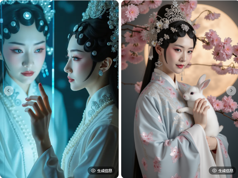 关键词:这是一个技术先进的形象,一个美丽的女人用她的手触摸镜子。镜子里的图像显示了一个穿着机械的女人,拥有一种科技感。触摸她的手指,文字“hello FLUX”集中在图像的顶部,给人一种未来科技的整体感觉。光线从上到下聚焦在人身上,在照片、服装、珍珠\(gemstone\)、发饰中营造氛围