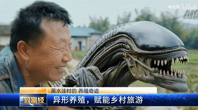 例如这段“农村养殖异形致富”的视频,不仅画面非常符合实地采访的风格,其中异形和村民之间的相处还真的毫无违和感。如果不是“异形”这一生物太过逆天,可能还真的有人会以为这是一档财经频道的农村致富节目。