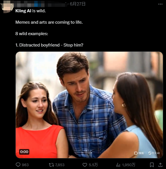 最重要的是,由于Sora还未正式对公众开放,而可灵已经于最近抢先一步开启了测试——所以,可灵这个“后起之秀”也就因此一跃而上,成为了这段时间在社交平台上最火的AI视频生成工具。