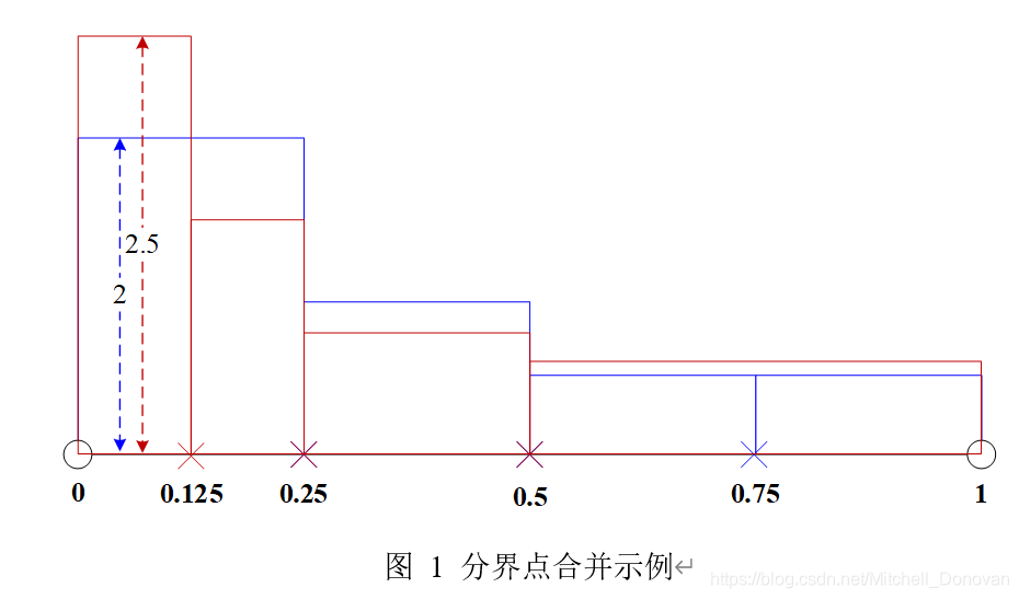 。每组分界点个数为(K-1) ,这(K-1)个分界点将整个区间分割成K个子区间。已知每一组分界点的位置和由这组分界点分割成的K 个子区间的样本密度,请计算由这两组分界点的并集分割成的子区间的样本密度的平均值。如图1所示,区间[0,1]