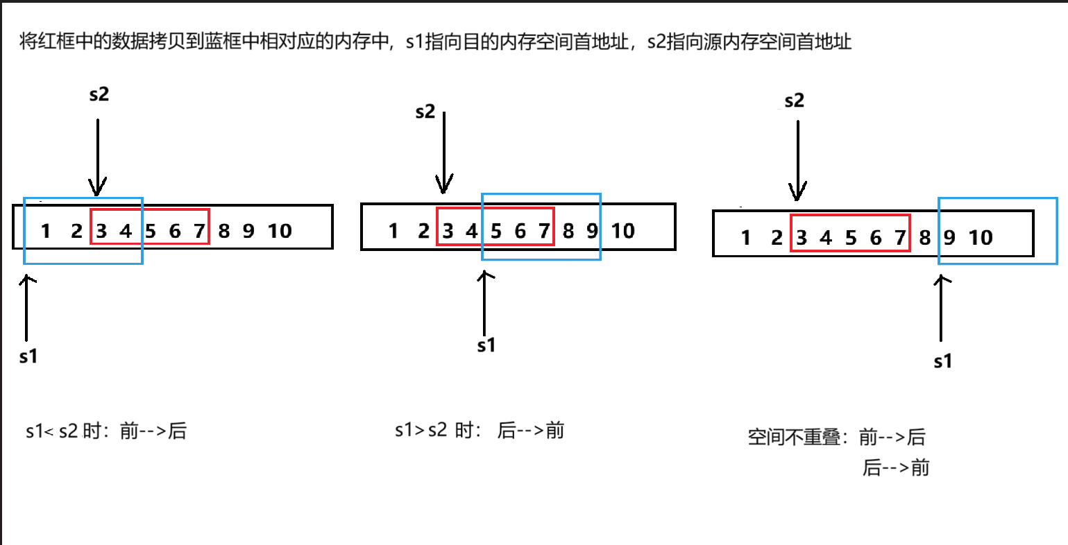 (3)源空间内存块与目标空间内存块不重叠,从前到后和从后到前拷贝均可。
