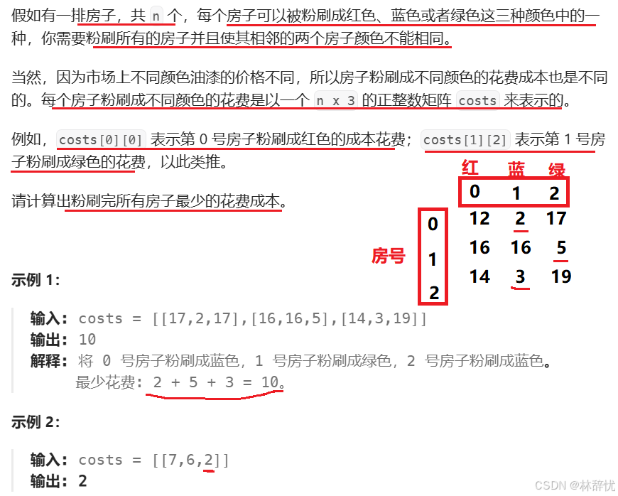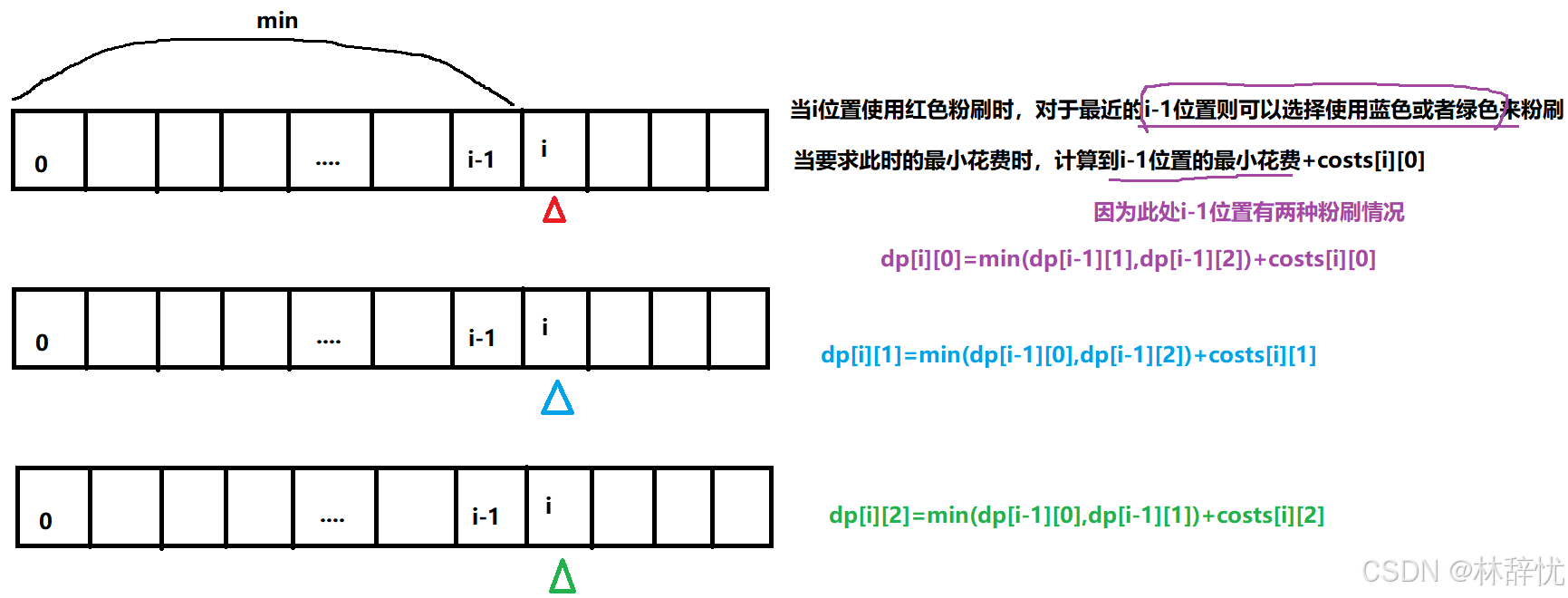 dp[i][0]:粉刷到i号房子时,且i号房子使用红色粉刷时的最少花费