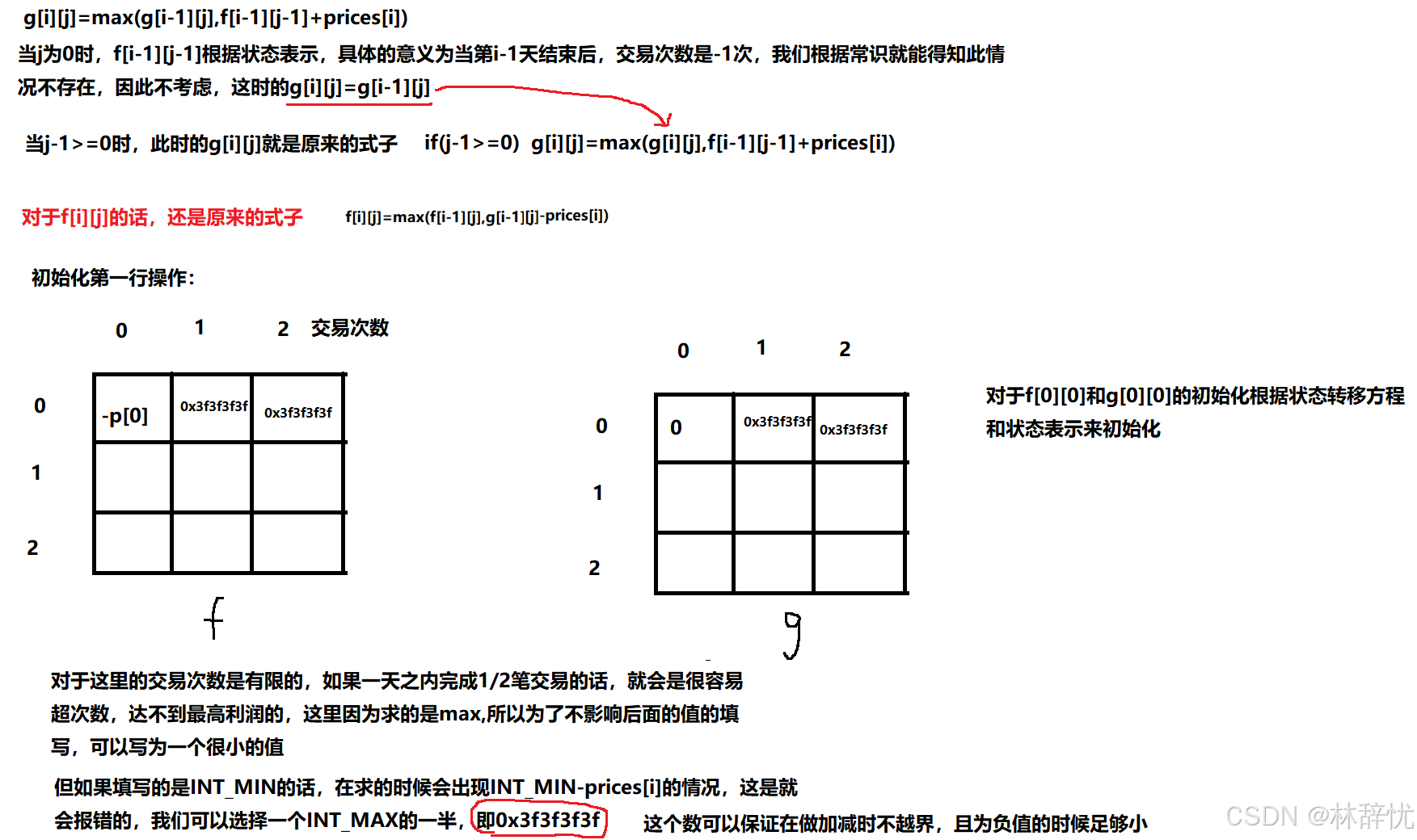 g[i][j]:表示当第i天结束后,完成了j次交易,且处于可交易状态,此时的最高利润