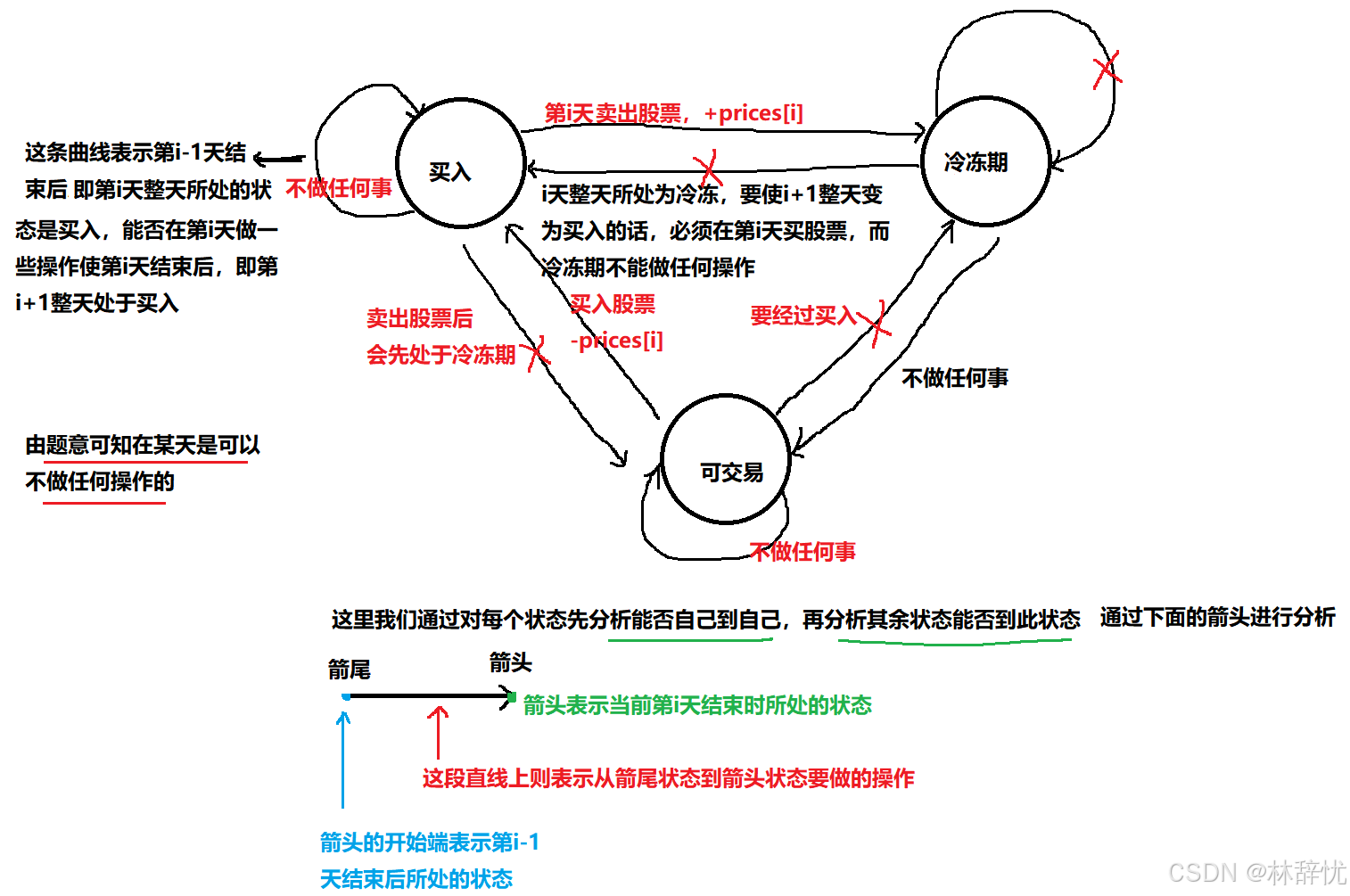 这里我们可以划分为三种状态的"买入","冷冻期(卖出股票后处于的状态)","可交易(手里没有股票,且没有处于冷静期)",为了方便表示可以采用n*3二维数组的形式表示