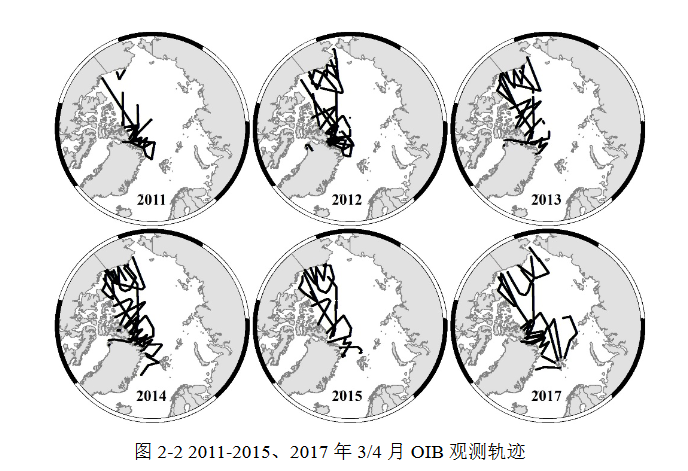 基本信息:机载 OIB 观测是为了弥补 ICESat-1 和 ICESat-2 两颗卫星运行时间间隔的数据空白, 自 2009 年开始,在每年的 3-5 月份期间使用激光雷达高度计等仪器在加拿大和格陵兰岛以北的厚冰区域进行海冰观测。