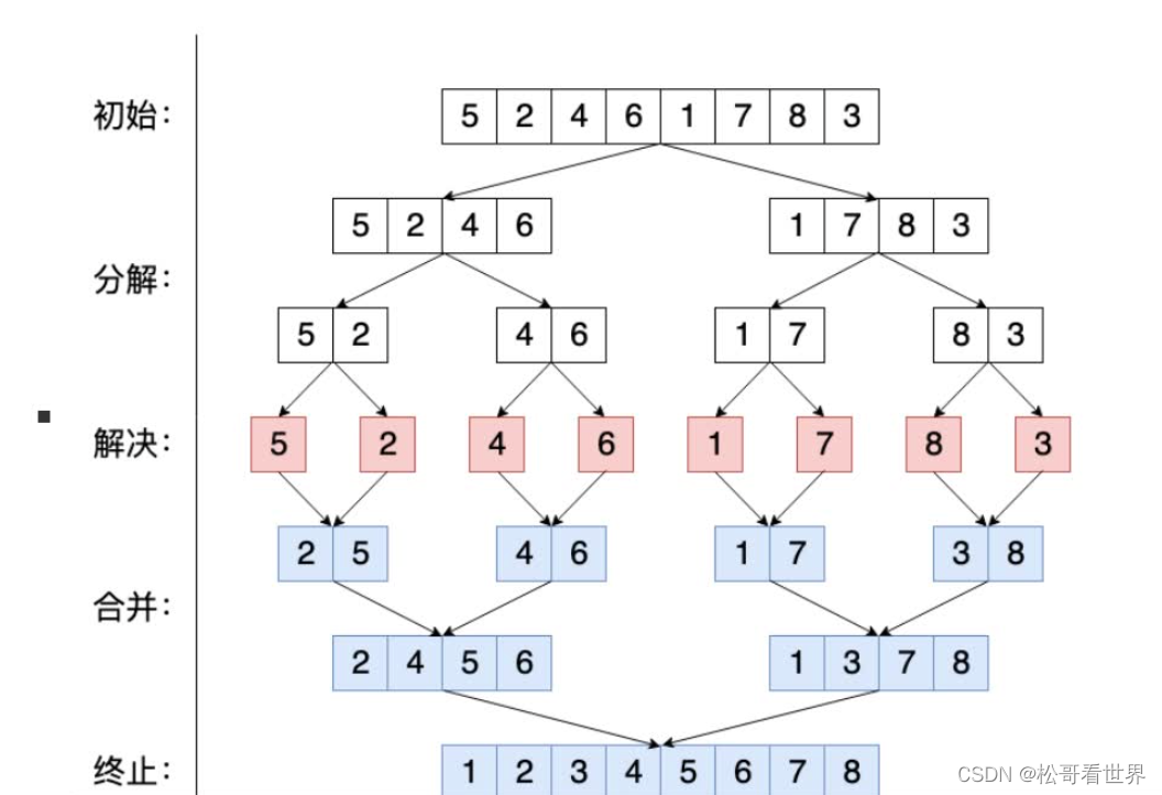 - 快速排序是从中间切开,归并排序这个直接拆,拆到最后一个数。 有个缺点,拆了那么多所以就是占内存空间