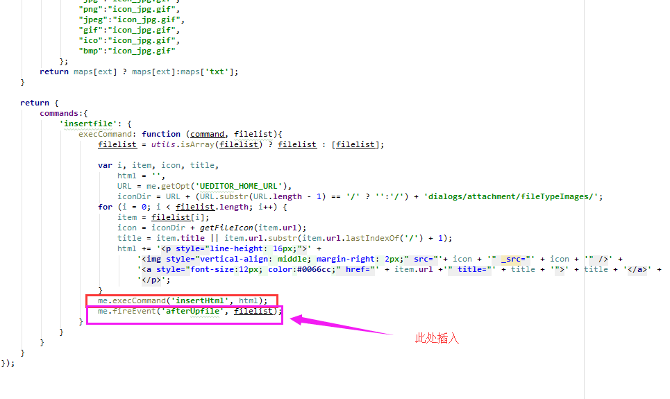 对于附件上传,ue源码中并未提供插入动作的相关事件,所以这里我们手动添加一个触发动作“afterUpfile”。