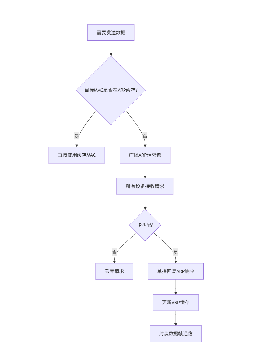 若知道对方 IP,但不知道 MAC,会使用 ARP 协议查找目标 MAC 地址,实现点对点通信。下图是数据链路层的执行流程。