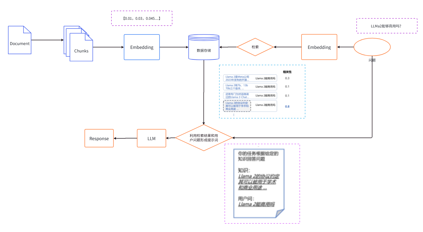 黄色部分表示检索生成的过程:输入问题——问题嵌入(Emedding)——从向量数据库中搜索——合并检索结果和问题——调用大模型——生成回答。