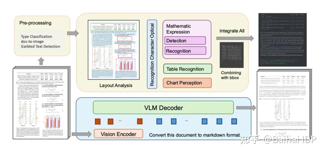 模块化Pipeline大致为:layout模型识别图文表的位置——OCR分类处理(公式:先进行检测在进行识别,可以通过大模型输出为laTex格式;表格:单独识别;图表:先得到内容,再与对应的位置信息结合)——最后在语义、上下文关系不变的前提下合并在同一个文档中,可以是MarDown等格式。这个方式的主要难点在于,版面的还原。