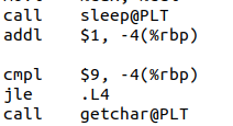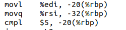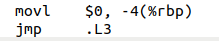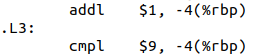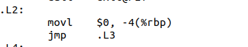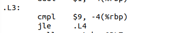 对于C程序中的i=0和i<10,.s文件中表示为movl $0, -4(%rbp)和cmpl $9, -4(%rbp)。