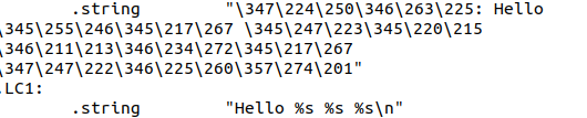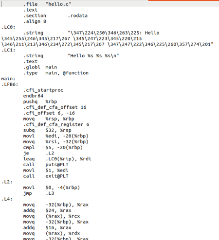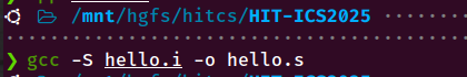 对hello.i文件进行编译,从hello.i变为hello.s,生成可阅读的汇编语言程序。