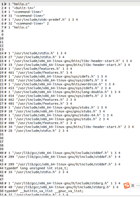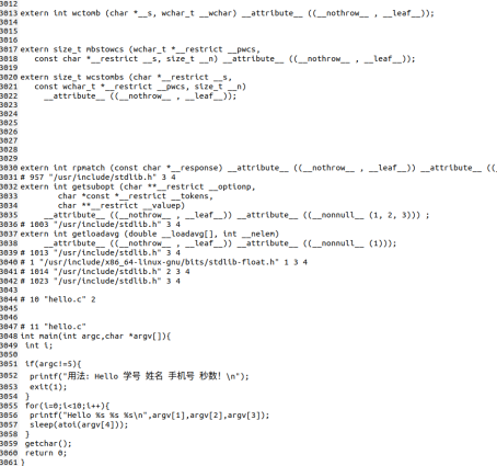 经过预处理后得到的hello.i文件在代码行数上远远多于最初的hello.c文件,这是因为在预处理过程中,将#开头的头文件程序、宏定义、特殊符号等插入到了代码当中,而原来的main函数则在.i文件的最末端。程序先对stdio.h、unistd.h、stdlib.h中的内容进行展开,如果头文件中仍然有以#开头的内容则继续展开,直到文本文件中没有头文件、宏定义等。