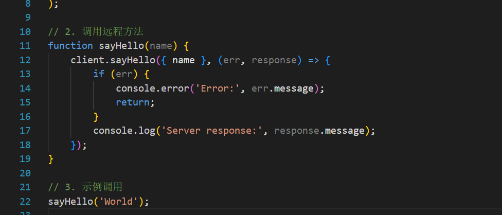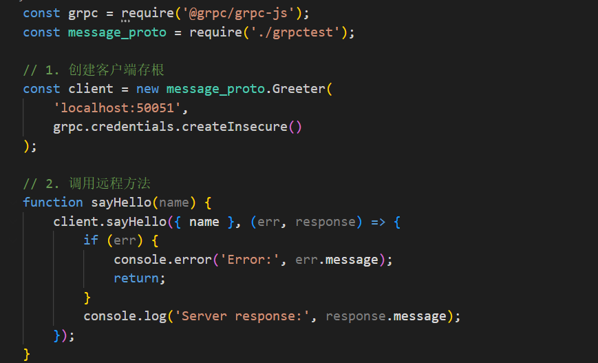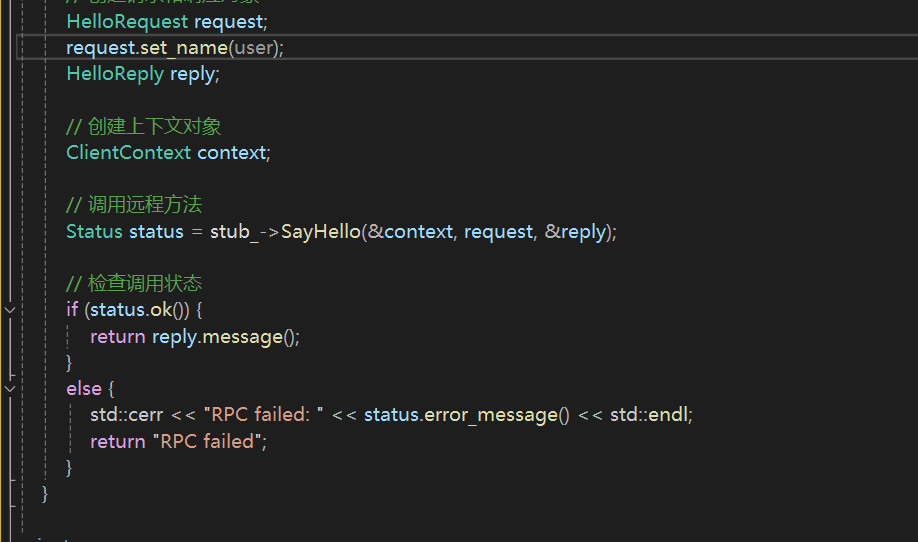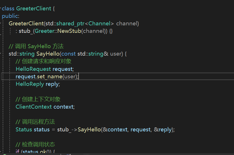 其中stub_->sayhello(),是在message.proto中约定的接口,通过stub_这个grpc管道调用,实现在服务器端,服务器会实现这个函数,当客户端调用时,服务器监听到就会启动自己的逻辑
