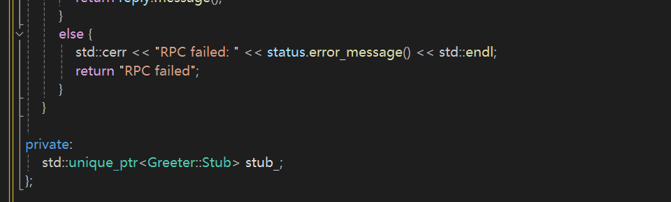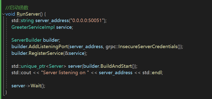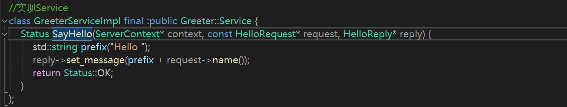 其中GreeterServiceImpl是一个实现 gRPC 服务的类,它继承自由 .proto 文件生成的 gRPC 服务基类 Greeter::Service,并使用 final 关键字修饰。