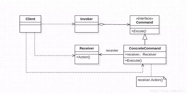 ——接收者角色(Receiver):负责具体实施和执行一个请求。任何类都可能成为一个接收者,只要它能够实现命令要求实现的相应功能。