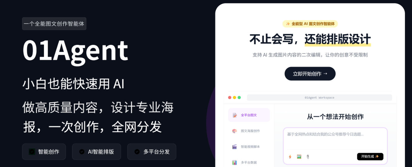 - 从想法到发布:用户不再需要在ChatGPT里写文案,去Midjourney生成图,再到Canva里排版。01Agent将选题、写作、设计、排版、发布打通,真正实现了“让创作回归本质”。