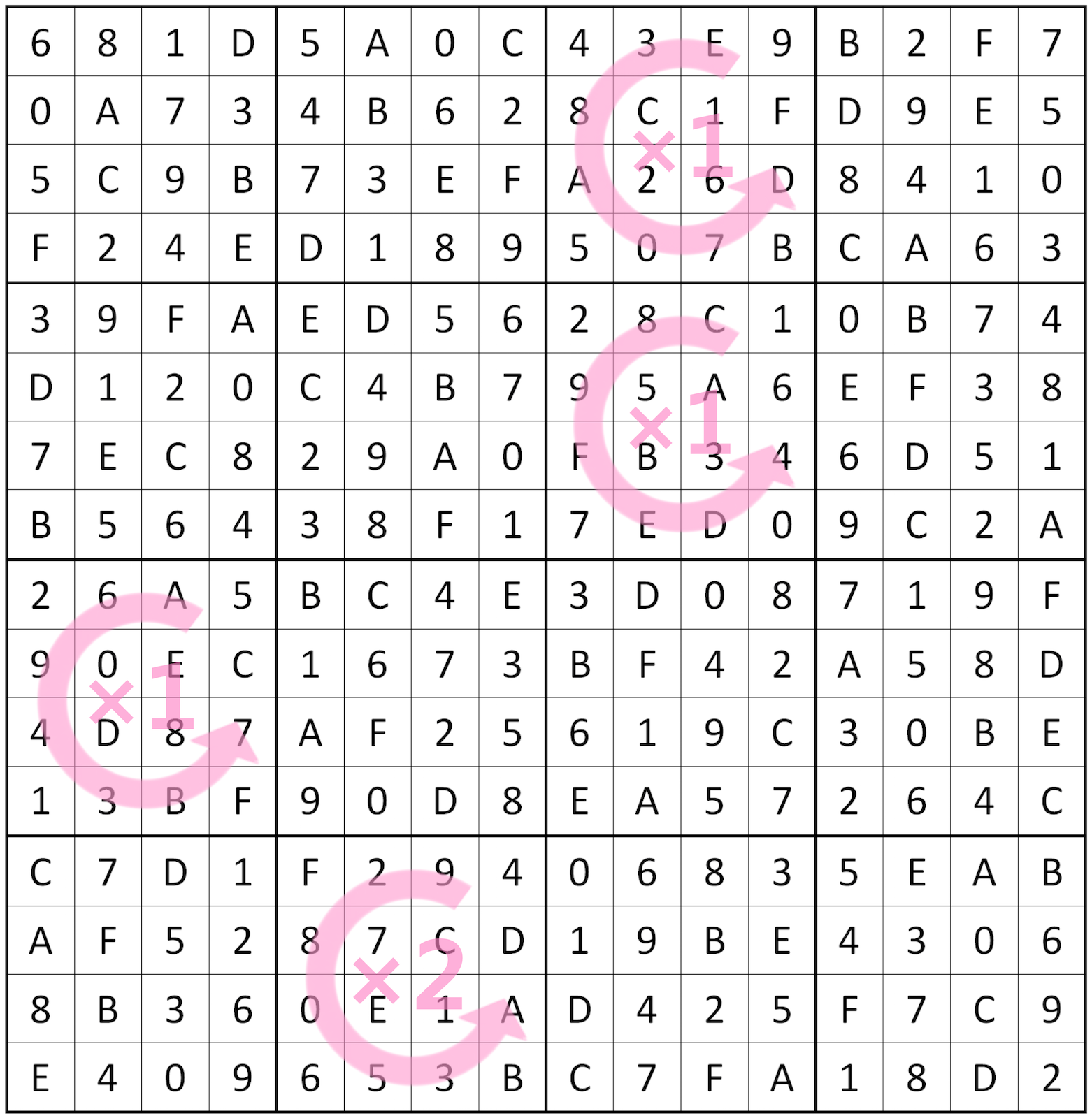 In this problem, let us focus on puzzles with 16×16 grids, which consist of 4×4 regions. The objective is to fill the whole grid with hexadecimal digits, i.e. 0123456789ABCDEF, so that each column, each row, and each region contains all hexadecimal digits. The figure below shows a solved sudoku.