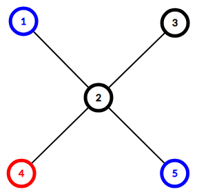 The only nice edge is edge (2,4)(2,4). Removing it makes the tree fall apart into components {4}{4} and {1,2,3,5}{1,2,3,5}. The first component only includes a red vertex and the second component includes blue vertices and uncolored vertices.