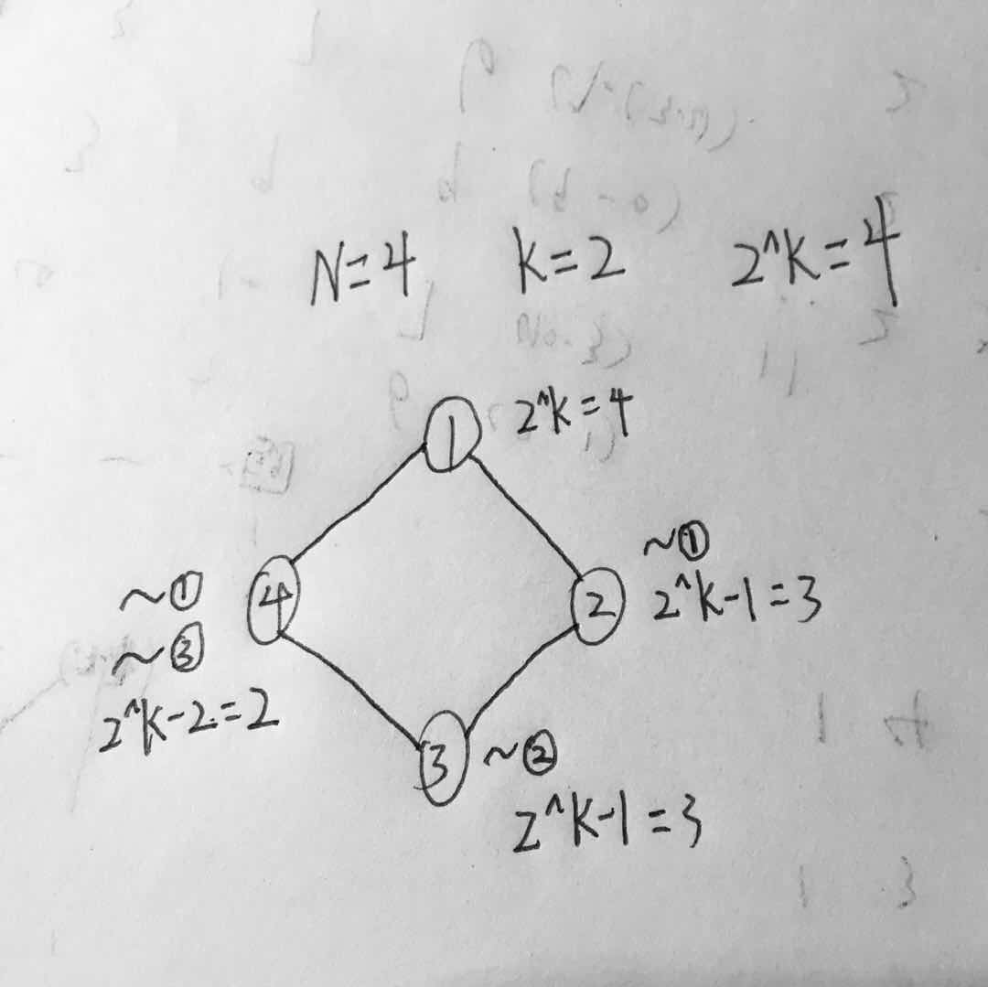 有 N 个客人 2^K 顶帽子, 每顶帽子编号为 1 ~ 2^K, N 个客人围成一个圈, 要求相邻两个客人的帽子编号(K位二进制)同或不为0。